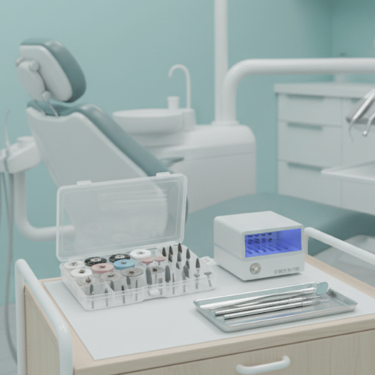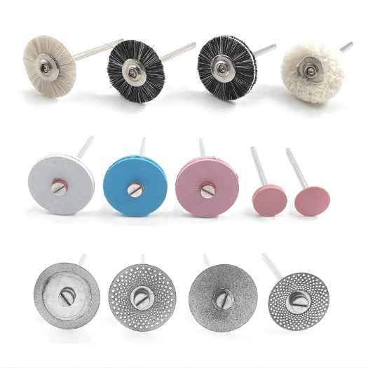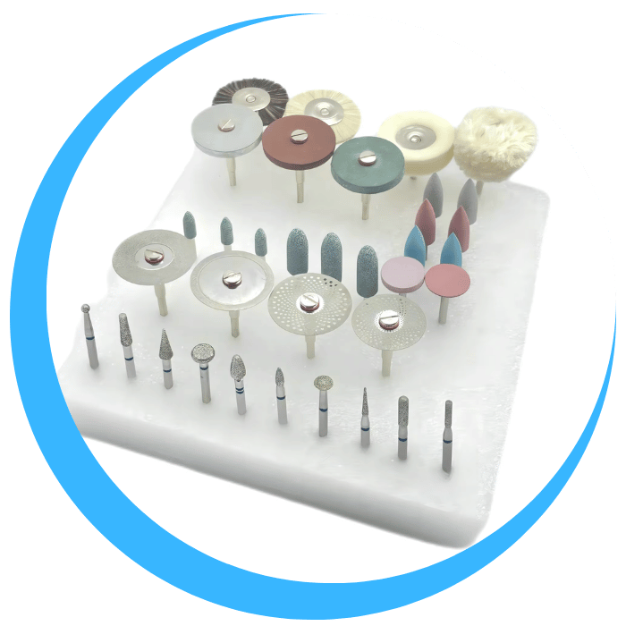 Nuestro kit incluye una amplia variedad de herramientas, desde fresas diamantadas hasta pulidores finos, diseñadas para cubrir todas las necesidades clínicas y de laboratorio en el acabado de prótesis dentales.