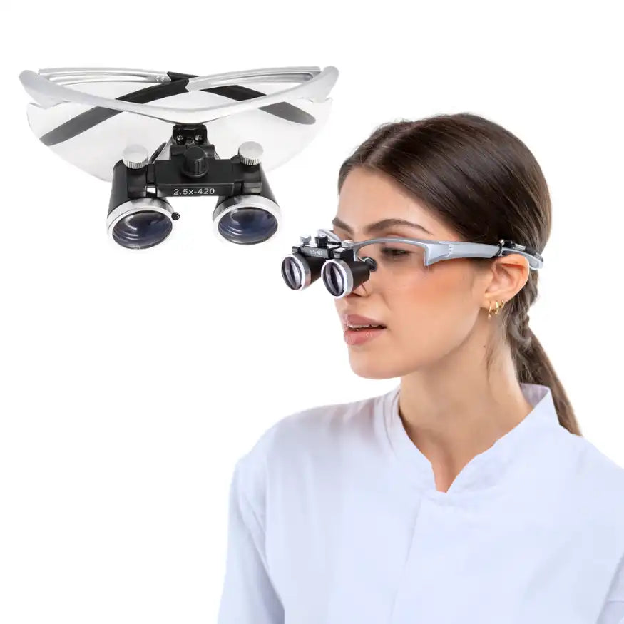 Lentes de cristal de excelente calidad óptica y ampliación de 2,5x o 3,5x. Distancia focal de 30 a 42 centímetros.